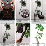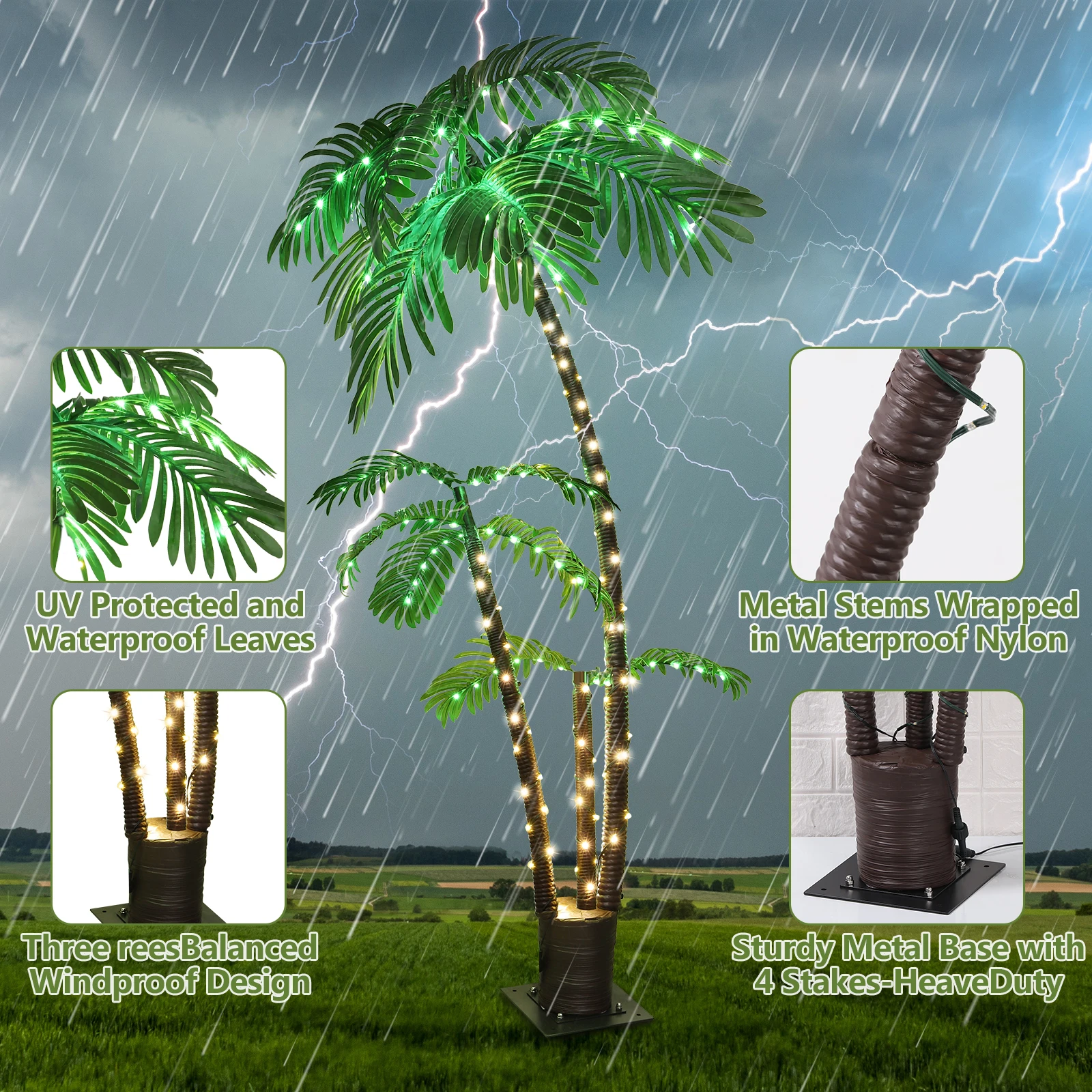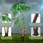 🌴 LED Artificial Palm Tree—- Unique palm tree design, brings you tropical island style.This palm tree uses a metal trunk wrapped in nylon rope, with a heavy-duty base and 4 ground stakes, which is beautiful and sturdy.