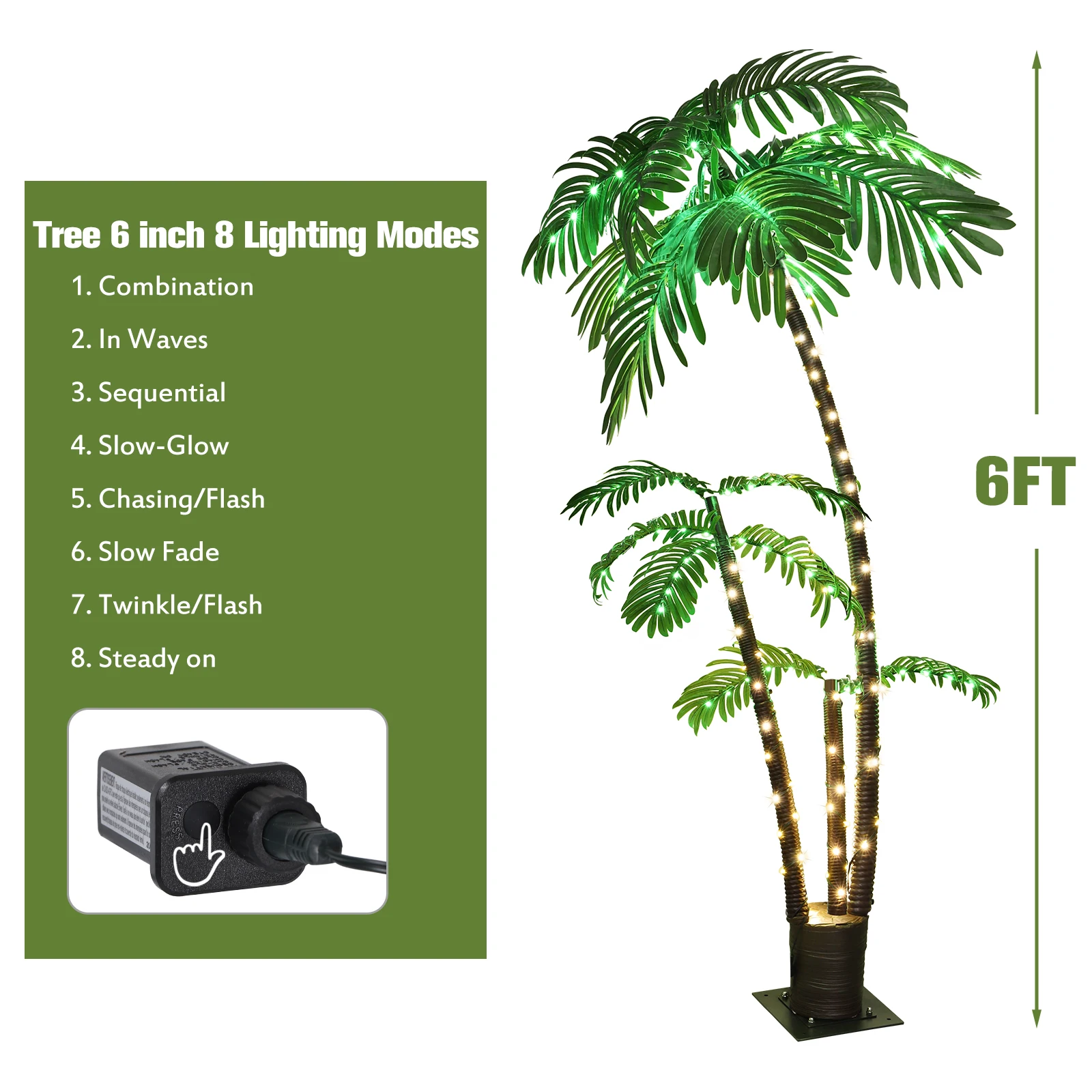 🌴Application Senario—- 8 different lighting modes (controlled with buttons on the plug). Suitable for Palm Sunday, St. Patrick's Day, Summer,Nativity, Wedding, Festival, Party, Vacation,Holiday Decoration.