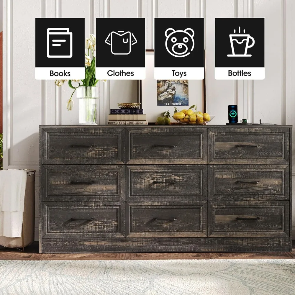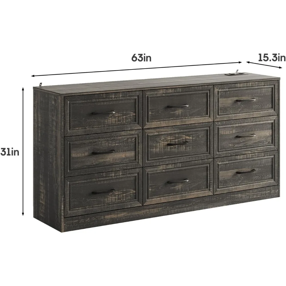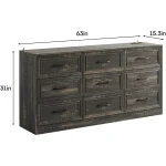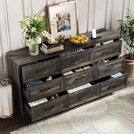 - 9 Drawer Dresser : The 9 drawer dresser provides ample storage space for your clothes, shoes, accessories, towels, blankets, and other daily necessities, keeping your room clean and tidy. And it has larger drawers that can hold more items. Whether placed in the bedroom or living room, it has its uniqueness.