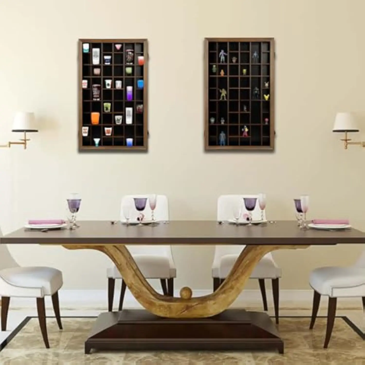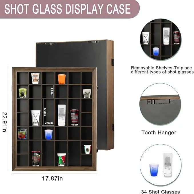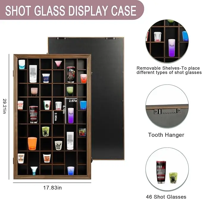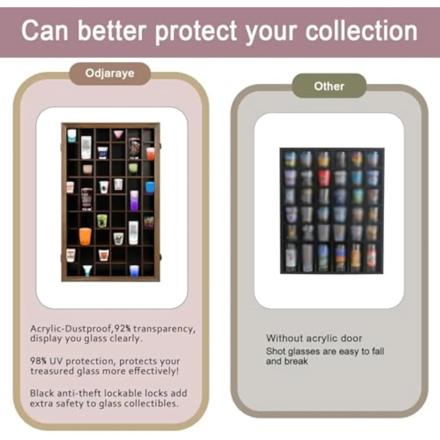 • HIGH QUALITY, ELEGANT DETAILS – Odjaraye’s classic wall-mount shot glass display case is made of Walnut finish wood for durability and sophistication, adding a touch of refined elegance to any wooden home decor you have. With shatterproof acrylic glass door and black metal anti-theft lock, Odjaraye shot glass case can well protect your cherished shot glass collections. The display cabinet can hold up to 46 shot glasses. (Shot Glass Not Included).
