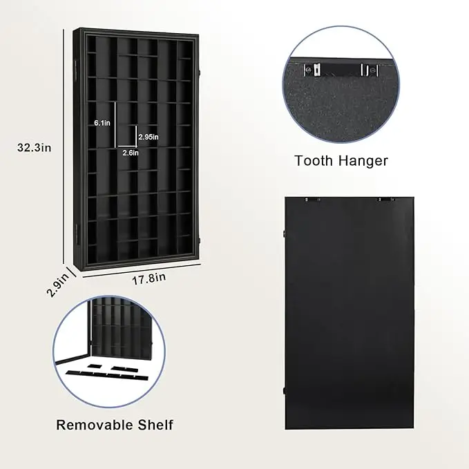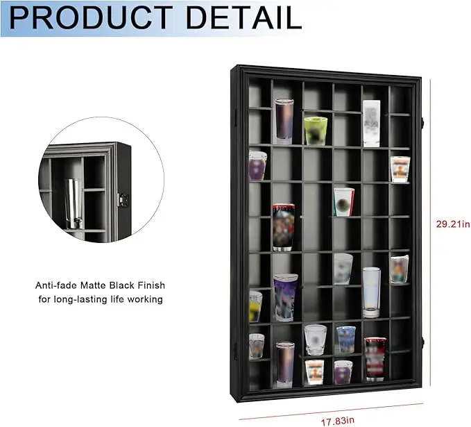 • REMOVABLE SHELVES FOR DIFFERENT SHOT GLASS – Our 29.21″x17.83″x2.95″shot glass hold display case – each narrow horizontal shelf is removable, providing a spacious display area while remaining compact enough to fit various mini collectibles such as shot glass and memorabilia. You can also display any minifigure, action figure,rocks, etc. Each small cup is 2.95″x2.67″, each large cup is 6.10″x2.67″.